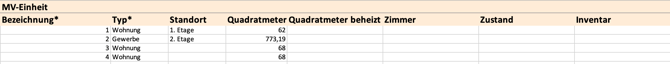Jede MV-Einheit wird in mindestens einer Zeile erfasst.Hat ein Mietvertrag mehrere Bestandteile (z. B. Wohnung + Keller + Stellplatz), muss pro Bestandteil eine eigene Zeile angelegt werden.