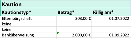 Weitere Kautionsfelder (z. B. Höhe der Kaution, Zahlungsdatum) sind gemäß Spaltenbezeichnung auszufüllen.