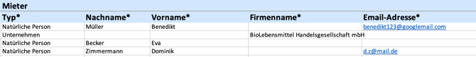 - Pro Mieter eine eigene Zeile anlegen.