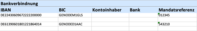 - Wenn eine Einheit mehrere Eigentümer und/oder mehrere Bankkonten hat, müssen in allen zugehörigen Zeilen die Angaben zu Immobilie; Gebäude; Einheit; Sondereigentum und Eigentümer identisch bleiben - nur die Bankdaten unterscheiden sich.