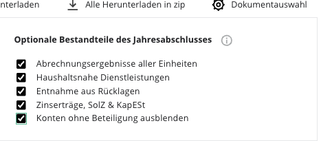 Klicken Sie im Jahresabschluss auf den Button 'Dokumentenauswahl' im rechten oberen Bereich der Tabelle.