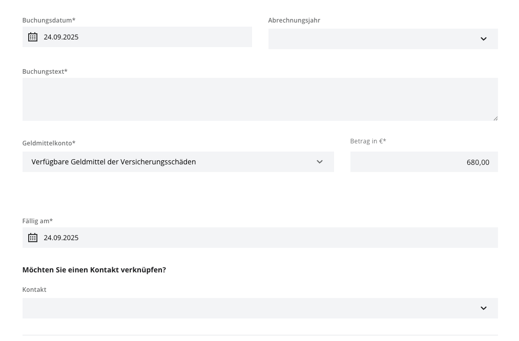 In SCALARA können Versicherungsschäden direkt über die vorhandenen Geschäftsvorfälle erfasst werden. Damit lassen sich Ausgaben (z. B. Reparaturkosten) und die spätere Erstattung durch die Versicherung korrekt abbilden.