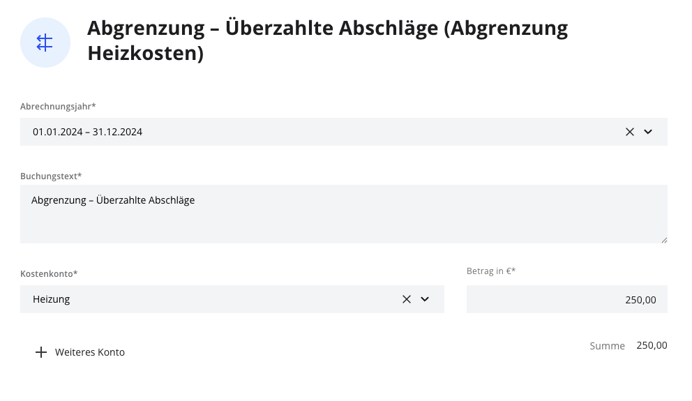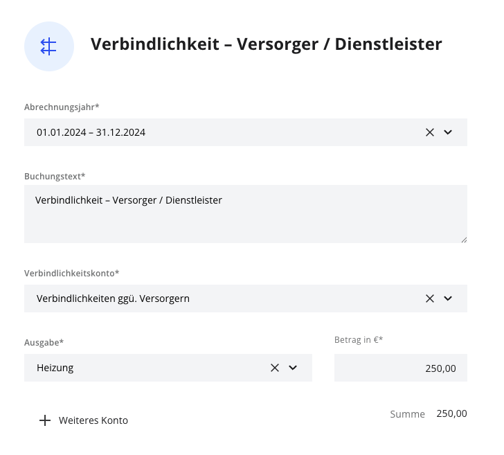 - Das Buchungsdatum ist immer das Jahr, in dem Sie die Versorgerabrechnung erhalten haben. In diesem Fall 2024.