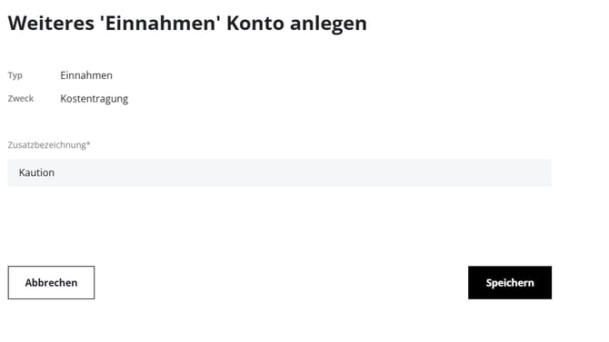 Um einen Kautionseingang zu verbuchen, legen Sie zunächst ein neues Einnahmenkonto an. Hierzu gehen Sie in die Kontenübersicht und fügen ein weiteres Einnahmenkonto hinzu. Dies können Sie z.B. 'Kaution' / 'Kautionseingang Mieter XY' etc. nennen.