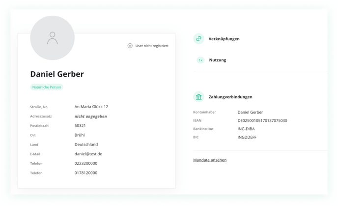 Hinterlegung aller Zahlungsinformationen auf Kontaktebene. Schnellere und automatischere Umsatzzuordnung durch verknüpfte Daten. Verfügbar im Kontakt.