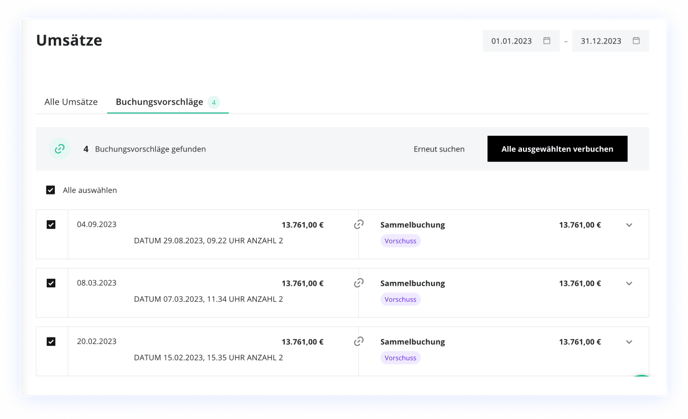 Buchungsvorschläge zu passenden Umsätzen und Banktransaktionen erhalten. Wegfall manueller Verbuchungen durch einfaches Annehmen von Vorschlägen. Verfügbar unter Umsätze für alle Verwaltungsformen.